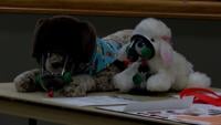 Pet oxygen masks displayed on stuffed animal dogs to demonstrate how they're used in emergencies.