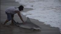 After Thorton gets the shark on the beach and he then proceeds to sit on the shark.