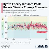 Cherry trees in Japan have been blooming exceptionally early in recent years. Data of these cherry tree bloom times go back over 1200 years.