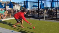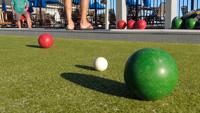 One team tosses a small white ball, known as the pallino, and players take turns rolling their bocce balls as close as possible to score points.