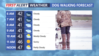 On Tuesday, temperatures range from 32°F in Long Neck and around 36°F in Dewey beach, with those temperatures increasing to around 45°F by 3:30 p.m., which coincides with cloud cover and winds from the west that will stay thick until 6:30 p.m.