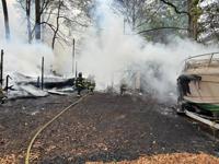 Crews were dispatched at 11:19 a.m. to the 26000 block of School Lane after neighbors reported hearing a loud boom and seeing flames coming from the property. Responders found a fully involved fire at what is believed to be an abandoned manufactured home, with flames spreading to nearby structures and debris.