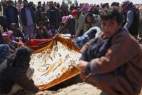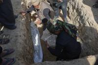 Following the burial on Saturday, men stood shoulder to shoulder in prayer over the fresh graves.