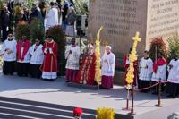 The celebration began with a procession of cardinals, bishops, priests and laypeople walking into the square carrying olive branches and palm fronds, some intricately braided. They stopped at the central obelisk, where Leo delivered an opening prayer, and then processed toward the altar to begin the Mass.