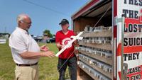Jon Luker, secretary and treasurer of '22 a Day' hands a cross to a fellow volunteer during the daily tribute to veterans lost to suicide.