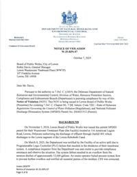DNREC cited the Lewes Board of Public Works for violating Title 7 of the Delaware Administrative Code, which prohibits unpermitted discharge of pollutants or liquid waste from a treatment system.