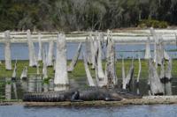 During the drawdowns, what used to be on the 9,500 acres (3,844 hectares) of submerged land becomes visible. Bear and deer tracks are spotted. Wild turkeys and sandhill cranes return to the dried-out land. Thousands of drowned and ghostlike cypress, palm and maple tree trunks reveal themselves as the water drops.
