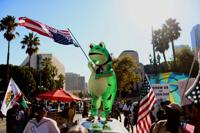 Some groups have started giving out the costumes to encourage more demonstrators to wear them. In Austin, Texas, college student Natalie McCabe got a free inflatable bald eagle costume. At the recent No Kings rally, she hung out with a unicorn and a frog.