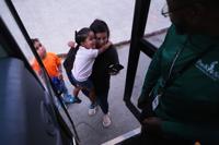 As children boarded the bus at a designated pickup spot near Southside Lions Park, cheerful bus monitors greeted them and strapped each one into their seat with a safety harness. Their bus driver offered each child a cartoon sticker for their school-provided backpacks.