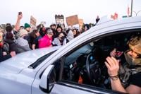 About 150 people, many carrying signs saying “No ICE or troops in the Bay,” referring to U.S. Customs and Immigration Enforcement, gathered shortly after dawn outside the base in Alameda. Police used at least one flash-bang grenade to clear a handful of demonstrators from the entrance as CBP vehicles drove through.