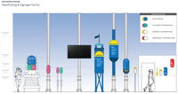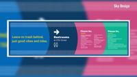 Proposed updates feature green and pink signs for rules and regulations, and blue and yellow signs to provide general information, such as restroom locations. (Sky Design)