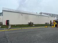 Smoke could be seen coming from the roof of the warehouse. According to the Roxana Volunteer Fire Company, responders opened a vent hole in the building's roof and worked up from inside to stop the fire. Courtesy Selbyville Volunteer Fire Company.