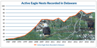 There were 82 active bald eagle nests observed in Delaware in 2023, up from four in 1987. Survey protocol and monitoring efforts have varied over the years and thus these numbers do not represent a complete count of all eagles in Delaware but do give an idea of trends. Courtesy of DNREC.
