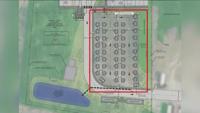 The site plan covers an acre. The main village area will have the 44 pallets and two bathroom buildings with showers and toilets. There is also space for storage units, a stormwater management facility, a community building, and a gathering building. There will also be a welcome center and parking lot with spots for people who have cars.