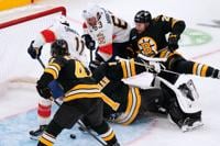 Boston Bruins goaltender Jeremy Swayman (1) drops to the ice for a save on a shot by Florida Panthers left wing Brad Marchand (63), before right wing Mackie Samoskevich (11) followed with the goal, during the first period of an NHL hockey game, Tuesday, Oct. 21, 2025, in Boston. (AP Photo/Charles Krupa)
