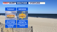 A warm front brings showers to Delmarva Monday night followed by a warmer Tuesday. High pressure dominates midweek with mild, dry conditions before rain returns Friday night into Saturday. Temperatures stay above normal for much of the week.