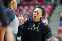 South Carolina head coach Dawn Staley, right, talks with a referee, left, during the second half of an NCAA college basketball game against Alabama, Thursday, Feb. 19, 2026, in Tuscaloosa, Ala. (AP Photo/Vasha Hunt)