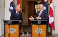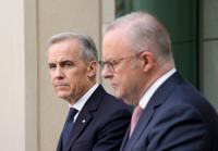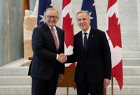 Canada's Prime Minister Mark Carney, left, and Australian Prime Minister Anthony Albanese participate in a joint news conference, in Canberra, Australia, Thursday, March 5, 2026. (Adrian Wyld/The Canadian Press via AP)