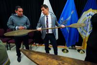 Natan Obed, President of Inuit Tapiriit Kanatami, left, stands with Adam van Koeverden, Secretary of State (Sport) and gold medal Olympic kayaker, as a selection of Inuit items, including a traditionally built Inuvialuit kayak and paddle, are unveiled at the Canadian Museum of History in Gatineau, Que., on Tuesday, Dec. 9, 2025. (Sean Kilpatrick /The Canadian Press via AP)
