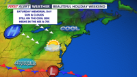 Saturday afternoon begins a cooler-than-average stretch across Delmarva, with gusty west-northwest winds and spotty cloud cover. While a slight chance of rain exists for far southern zones late Sunday, Memorial Day itself looks drier and warmer, with sunshine returning. Midweek brings increasing cloudiness and the potential for showers as systems approach from the west and south.