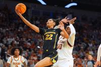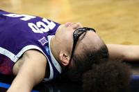 TCU guard Olivia Miles lies on the court after being fouled during the first half against South Carolina in the Elite Eight of the NCAA college basketball tournament Monday, March 30, 2026, in Sacramento, Calif. (AP Photo/Sara Nevis)