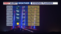 Conditions remain dry into the evening, with partly cloudy skies and overnight lows dropping into the low to mid 20s by Saturday morning.