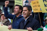 Rob Jetten,leader of the Democrats 66, D66, right, joined thousands of people who demonstrated calling for tougher action against climate change just days before the Oct. 29 general election in the Netherlands, in The Hague, Netherlands, Sunday, Oct. 26, 2025. (AP Photo/Peter Dejong)