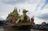A huge barge carrying Buddha statues floats during the Phaung Daw Oo pagoda festival in Inle Lake, southern Shan State, Myanmar, Tuesday, Sept. 23, 2025. (AP Photo/Thein Zaw)