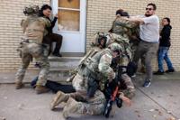 Government officials push back protesters in Chicago, Tuesday, Oct. 14, 2025. (Anthony Vazquez/Chicago Sun-Times via AP)