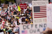 FILE - A person holds an American flag upside-down during a "No Kings" protest Oct. 18, 2025, in Denver. (AP Photo/David Zalubowski, File)