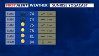 A weak front brings isolated thunderstorms this afternoon, followed by a clear and quiet night with patchy fog possible and temperatures in the upper 60s to low 70s.
