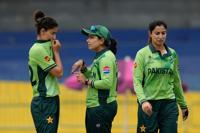 Pakistan's captain Fatima Sana, center, speaks to Pakistan's Diana Baig during the ICC Women's Cricket World Cup match between India and Pakistan at Premadasa Stadium in Colombo, Sri Lanka, Sunday, Oct, 5, 2025. (AP Photo/Eranga Jayawardena)