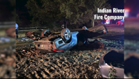 Firefighters say the car struck a bulkhead berm, hit pilings and overturned into the bay, coming to rest on its roof amid extremely low tidal conditions.