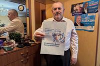 Opposition politician Boris Nadezhdin holds a poster while speaking to journalists, in Moscow, Wednesday, April 1, 2026. (AP Photo)