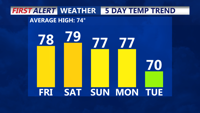 Mild and sunny conditions will give way to cooler temperatures as a cold front moves across Delmarva Sunday night into Monday.