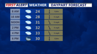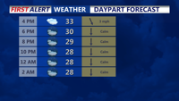Conditions remain dry into the evening, with partly cloudy skies and overnight lows dropping into the low to mid 20s by Saturday morning.