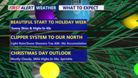 High pressure brings sunshine and cool temperatures to Delmarva today before a weak system brings a chance of light snow/rain showers Tuesday, followed by quieter but uncertain weather heading into Christmas and the end of the week.