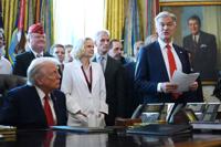 President Donald Trump speaks before signing an executive order on addiction recovery in the Oval Office of the White House, Thursday, Jan. 29, 2026, in Washington, as from left Interior Secretary Doug Burgum, Kathryn Burgum, Health and Human Services Secretary Robert F. Kennedy Jr. and Centers for Medicare & Medicaid Services administrator Dr. Mehmet Oz watch. (AP Photo/Allison Robbert)