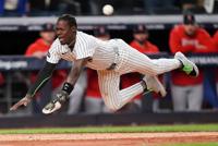 FILE - New York Yankees Jazz Chisholm Jr. dives into home plate to score on a hit by Austin Wells against the Boston Red Sox during the eighth inning of Game 2 of an American League wild-card baseball playoff series, Oct. 1, 2025, in New York. (AP Photo/Frank Franklin II, file)