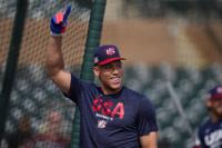 Aaron Judge is trading pinstripes for a plain jersey with red, white and blue letters.