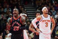 Toronto Raptors' Jamal Shead, left, and New York Knicks' Josh Hart (3) react to a call during the first half of an NBA Cup basketball game in Toronto, Tuesday, Dec. 9, 2025. (Sammy Kogan/The Canadian Press via AP)