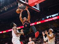 Toronto Raptors' Scottie Barnes (4) dunks as New York Knicks' Josh Hart (3), right, reacts during the first half of an NBA Cup basketball game in Toronto, on Tuesday, Dec. 9, 2025. (Sammy Kogan/The Canadian Press via AP)