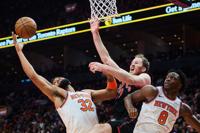 Toronto Raptors' Jakob Poeltl (19) is stopped at the net by New York Knicks' Karl-Anthony Towns (32) and New York Knicks' OG Anunoby (8) during the first half of an NBA Cup basketball game in Toronto, Tuesday, Dec. 9, 2025. (Sammy Kogan/The Canadian Press via AP)