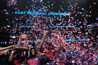 UConn players celebrate after their win against Duke in the Elite Eight of the NCAA college basketball tournament, Sunday, March 29, 2026, in Washington. (AP Photo/Abbie Parr)