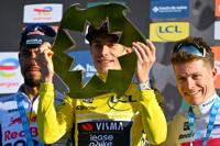Jonas Vingegaard of Denmark, wearing the overall leader's yellow jersey, center, Daniel Martinez Poveda of Colombia,left and second place, and Georg Steinhauser of Germany, third place and wearing the best young rider's white jersey, celebrate on the podium after the last stage of the Paris Nice cycling race with start and finish in Nice, France, Sunday, March 15, 2026. (AP Photo/Philippe Magoni)