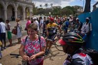 People wait for the arrival of a public bus to transport their bicycles across the Bay Tunnel in Havana, Wednesday, April 8, 2026. (AP Photo/Ramon Espinosa)