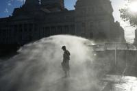 Protesters are sprayed by a police water cannon in front of Congress during a march by trade unions and opposition groups against a labor reform bill proposed by President Javier Milei's government in Buenos Aires, Argentina, Thursday, Feb. 19, 2026. (AP Photo/Rodrigo Abd)