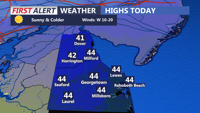 A brisk, sunny day is in store for Delmarva, with high temperatures reaching the low to mid 40s, feeling more like the 30s. Canadian high pressure continues to build over the region, bringing dry and colder conditions through the weekend. Temperatures dip significantly overnight, with lows in the low to mid-20s. The pattern of cool, dry weather persists until early next week, when chances of rain emerge with approaching low-pressure systems.