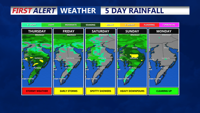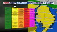 Thursday will bring showers and possible severe storms to Delmarva, Coastal Sussex County, and Southern Coastal Delaware, with cooler temperatures and continued precipitation through Friday.