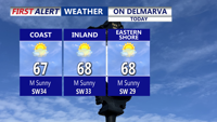 A stretch of unsettled weather is setting up for Delmarva starting today as a series of systems bring shifting winds, temperature swings, and chances for rain. Strong southwest winds up to 50 mph are possible tonight as a cold front moves through, followed by a brief cool-down Thursday and another round of unsettled weather heading into the weekend.